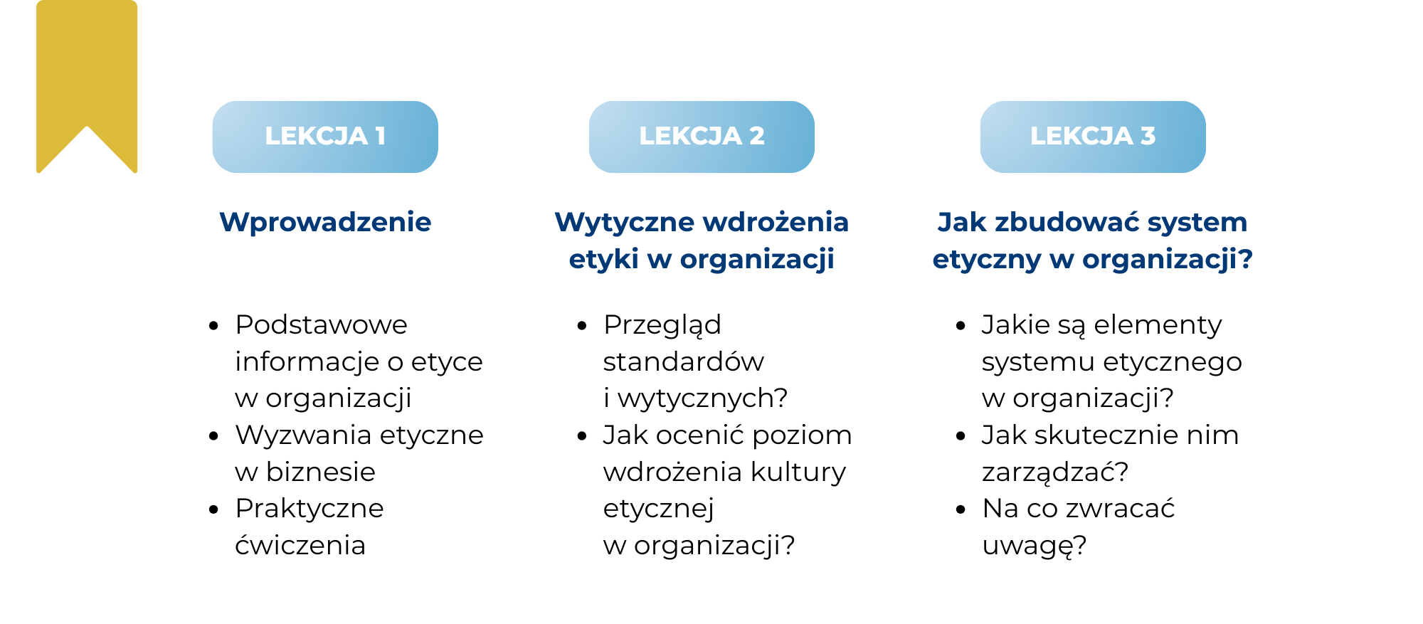 Szkolenie zawiera przykłady, pytania oraz materiały źródłowe, które wspierają samodzielną refleksję nad etyką i jej zastosowaniem w realiach własnej organizacji. Studia przypadków zachęcają do analizy dylematów etycznych i samodzielnego wyciągania wniosków.